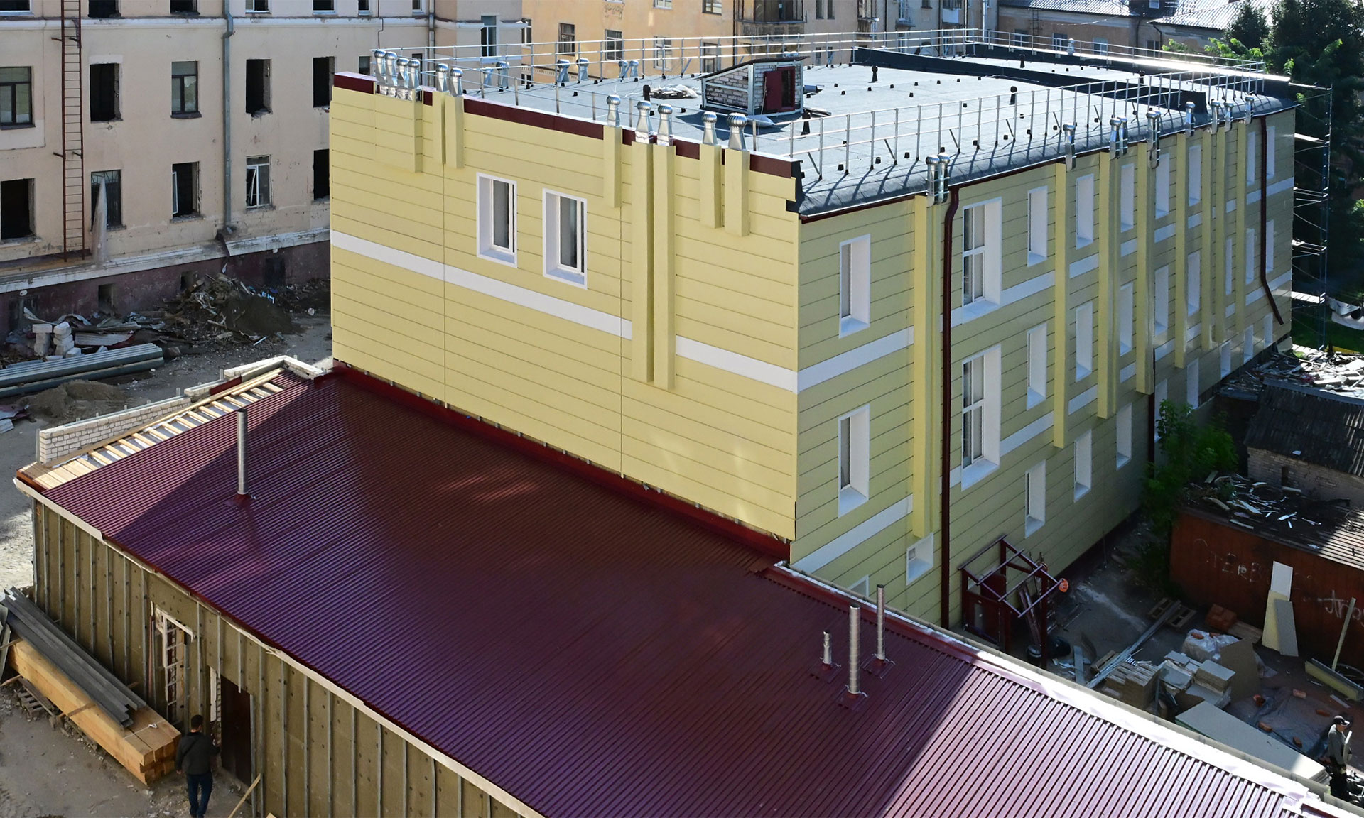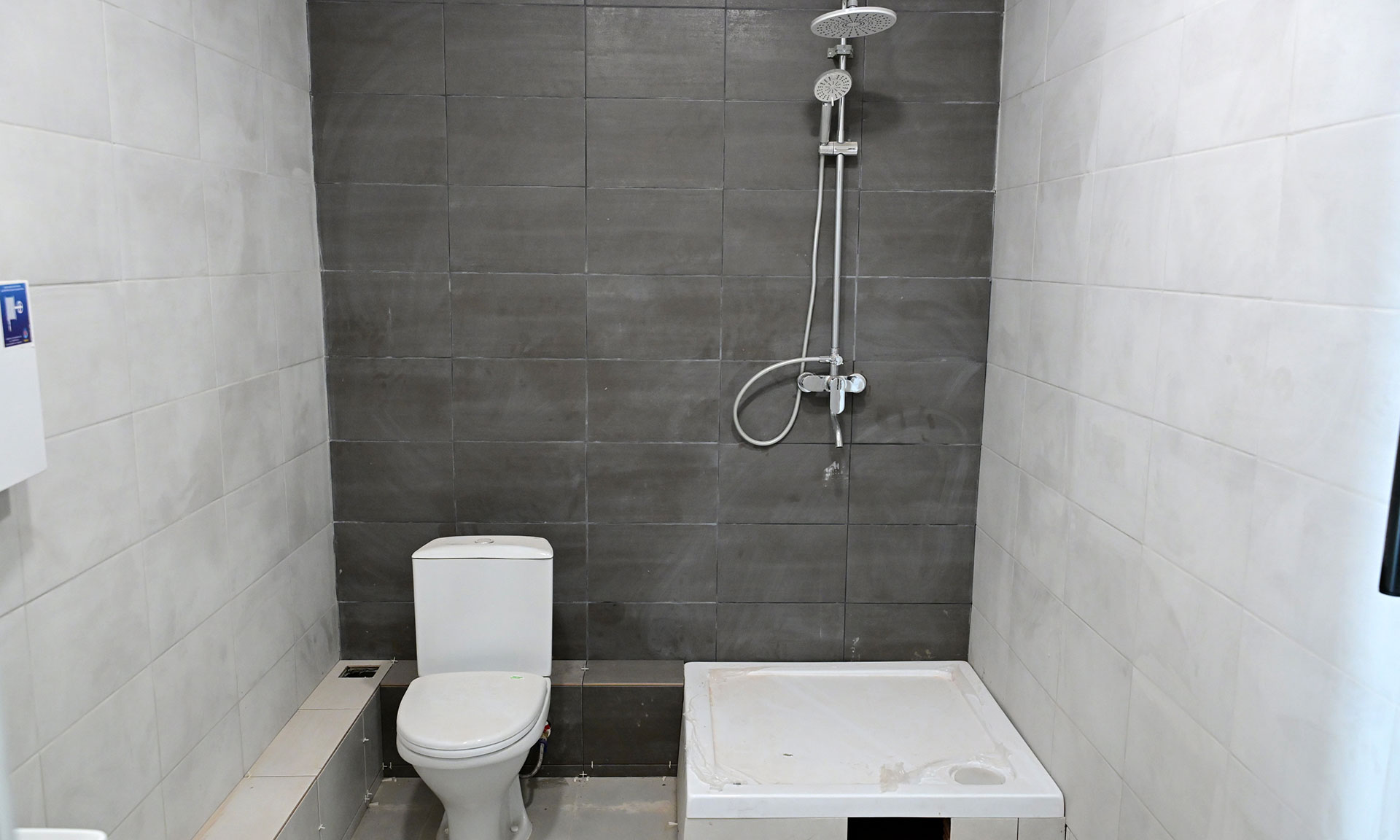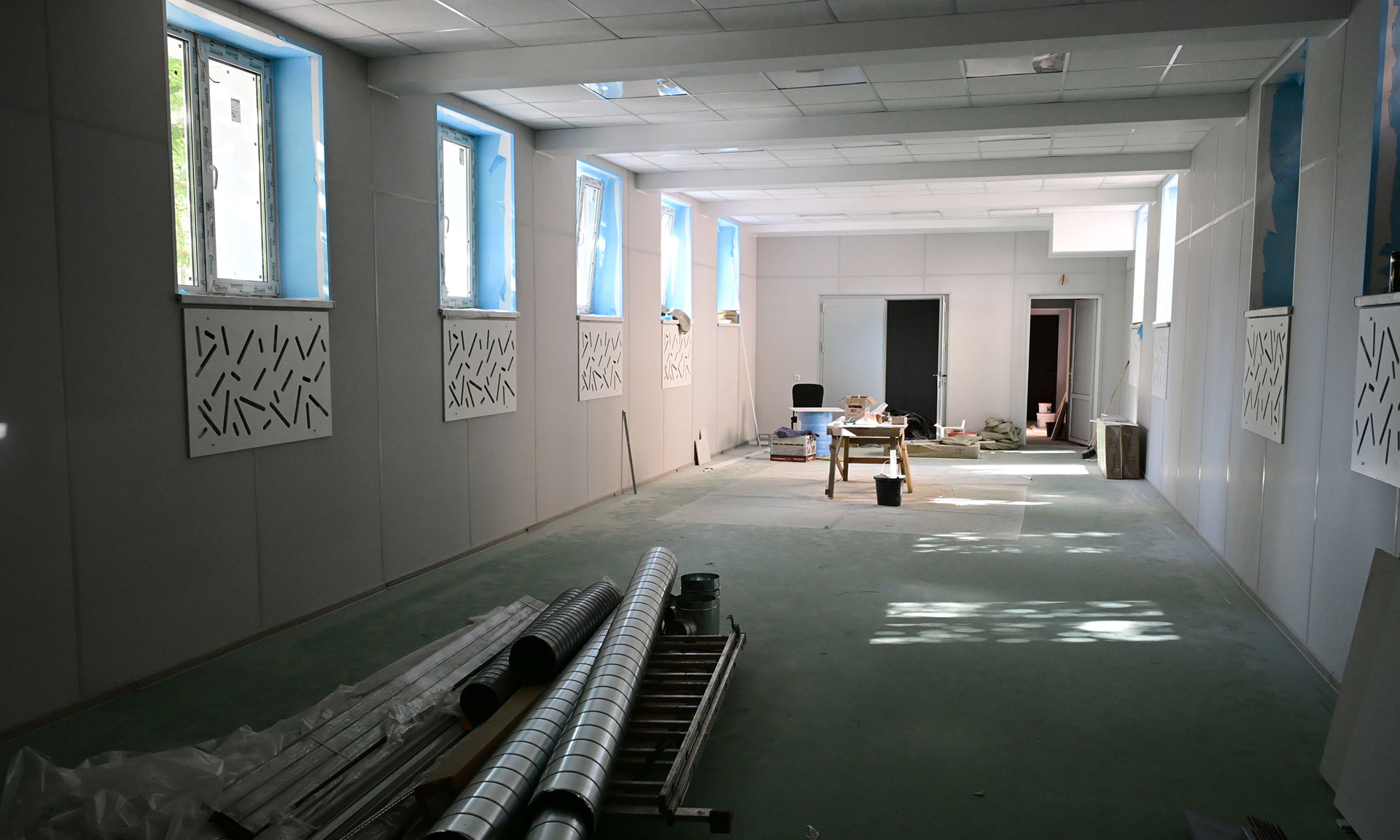 Спортзал уже готов полностью, осталось сделать фасад и благоустроить территорию — уложить новый асфальт. Общежитие приводят в порядок после отделочных работ, завозят мебель.