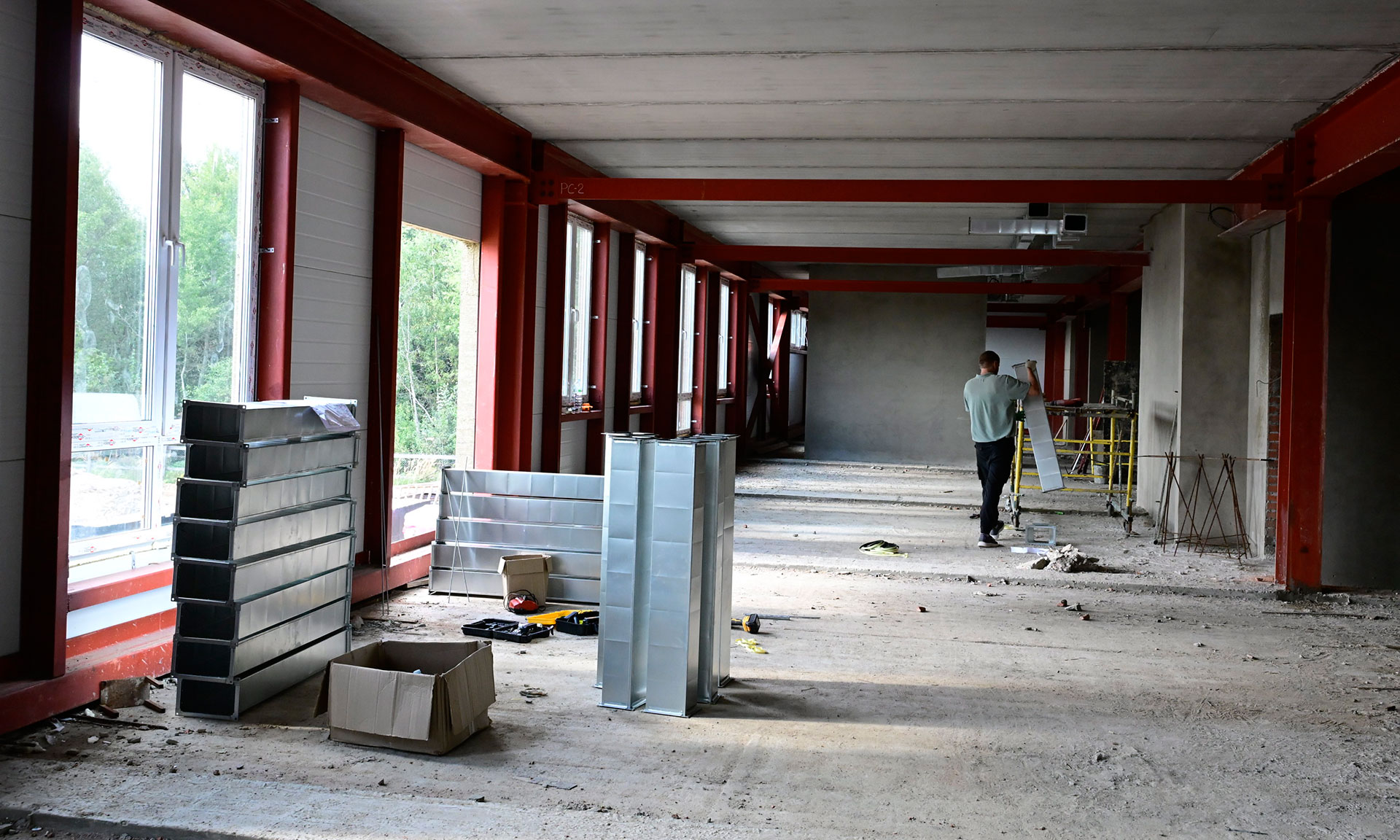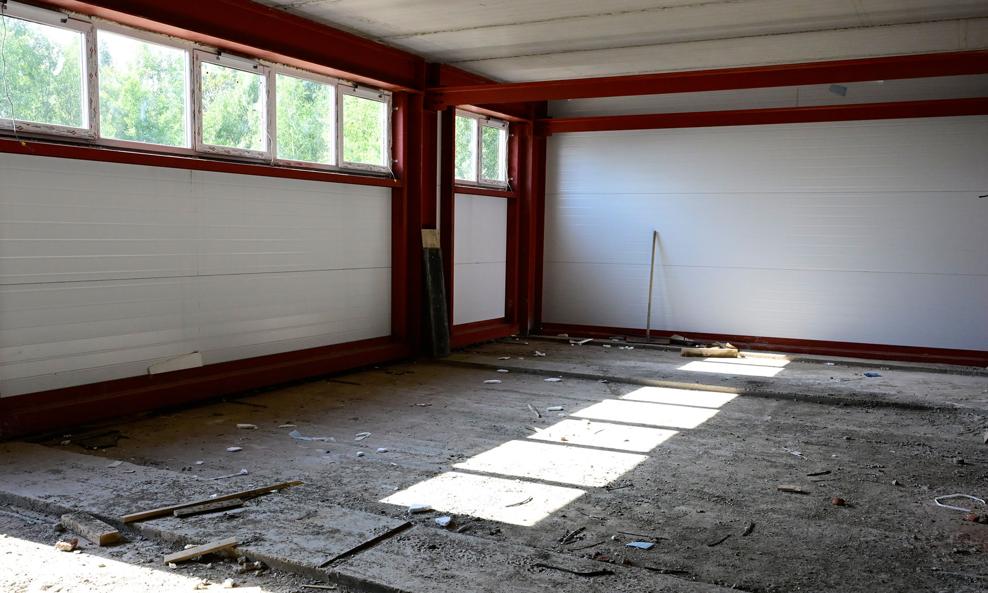 Сейчас смонтированы металлические колонны, отштукатурены перегородки в административной части, смонтирована котельная.
