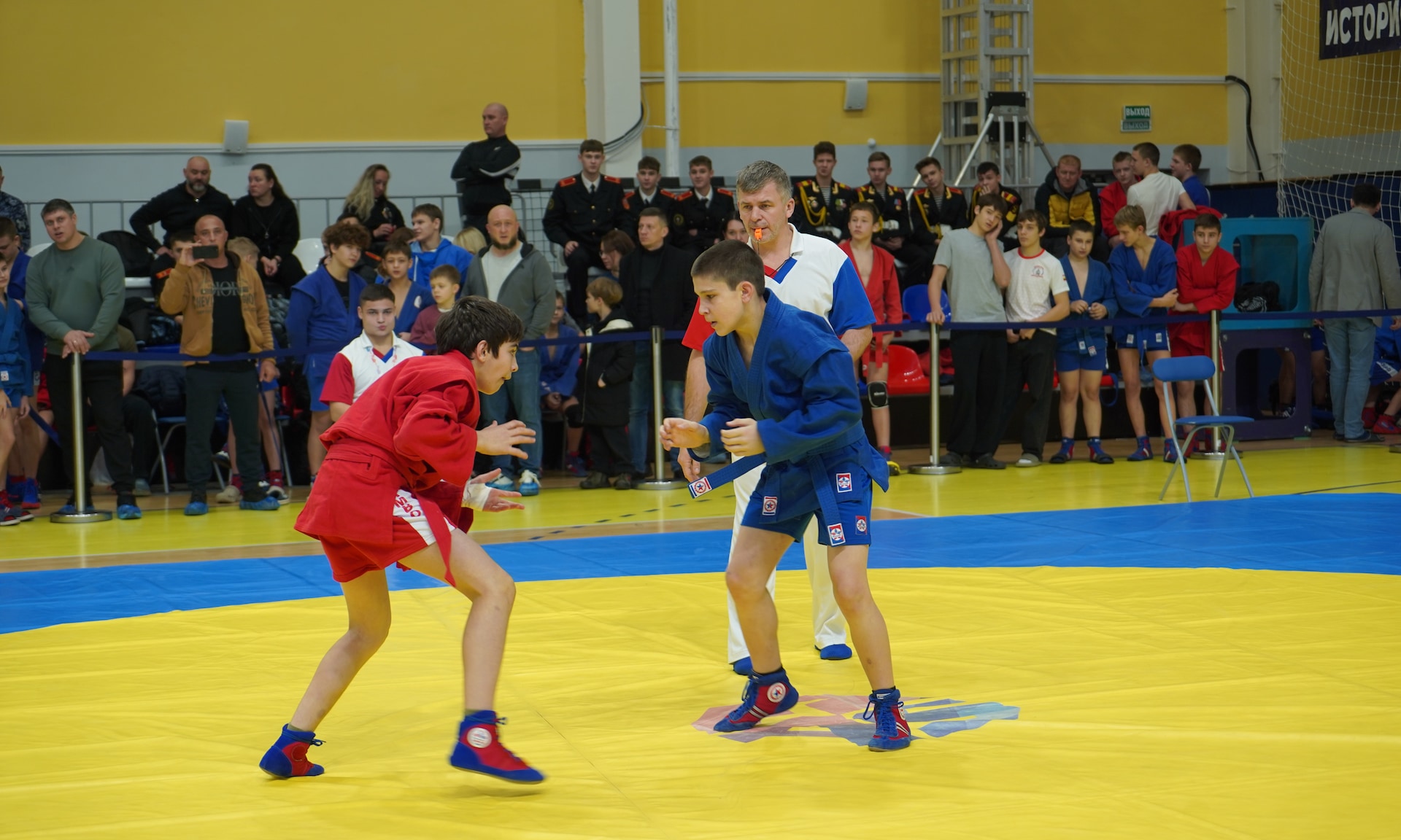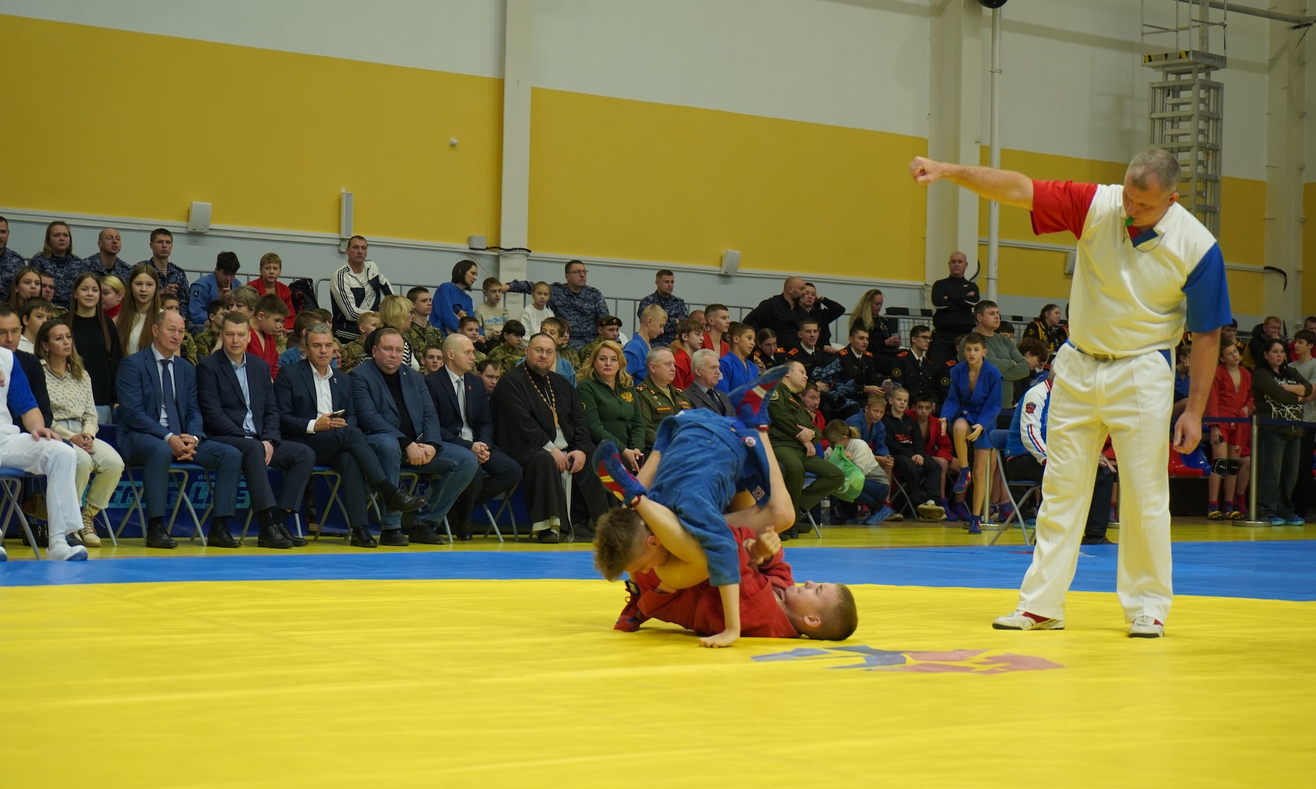Соревнования проходят в одном из лучших спортивных сооружений нашей страны, во Дворце единоборств имени Артема Ивановича Осипенко. Это еще раз говорит о том, что для того, чтобы воспитать настоящих защитников, нам нужно, чтобы наши дети занимались спортом. И один из таких видов спорта — это, конечно же, самбо, наш национальный вид спорта, самооборона без оружия.