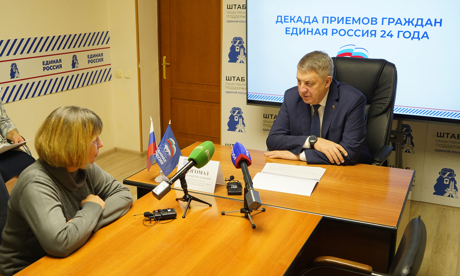 2 декабря Губернатор Брянской области, секретарь Брянского регионального отделения Всероссийской политической партии «Единая Россия» Александр Богомаз провел прием граждан в штабе общественной поддержки Всероссийской политической партии «Единая Россия».