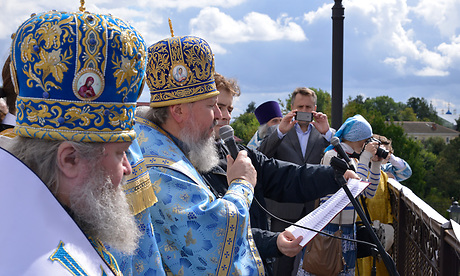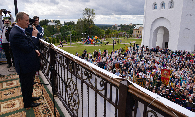 Николай Денин, обращаясь затем к собравшимся у стен главного храма Брянщины отметил объединяющее начало состоявшегося события, поблагодарил всех, кто пожертвовал деньги на возрождение из руин Успенского собора, взорванного в 1930 году.