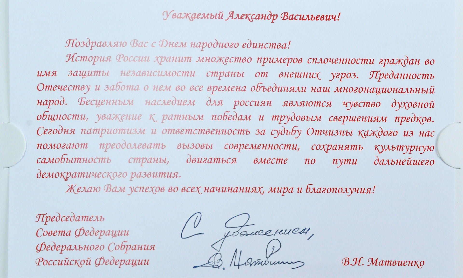 На имя Губернатора Брянской области Александра Богомаза поступило поздравление от председателя Совета Федерации Федерального Собрания РФ Валентины Матвиенко с Днем народного единства.