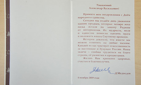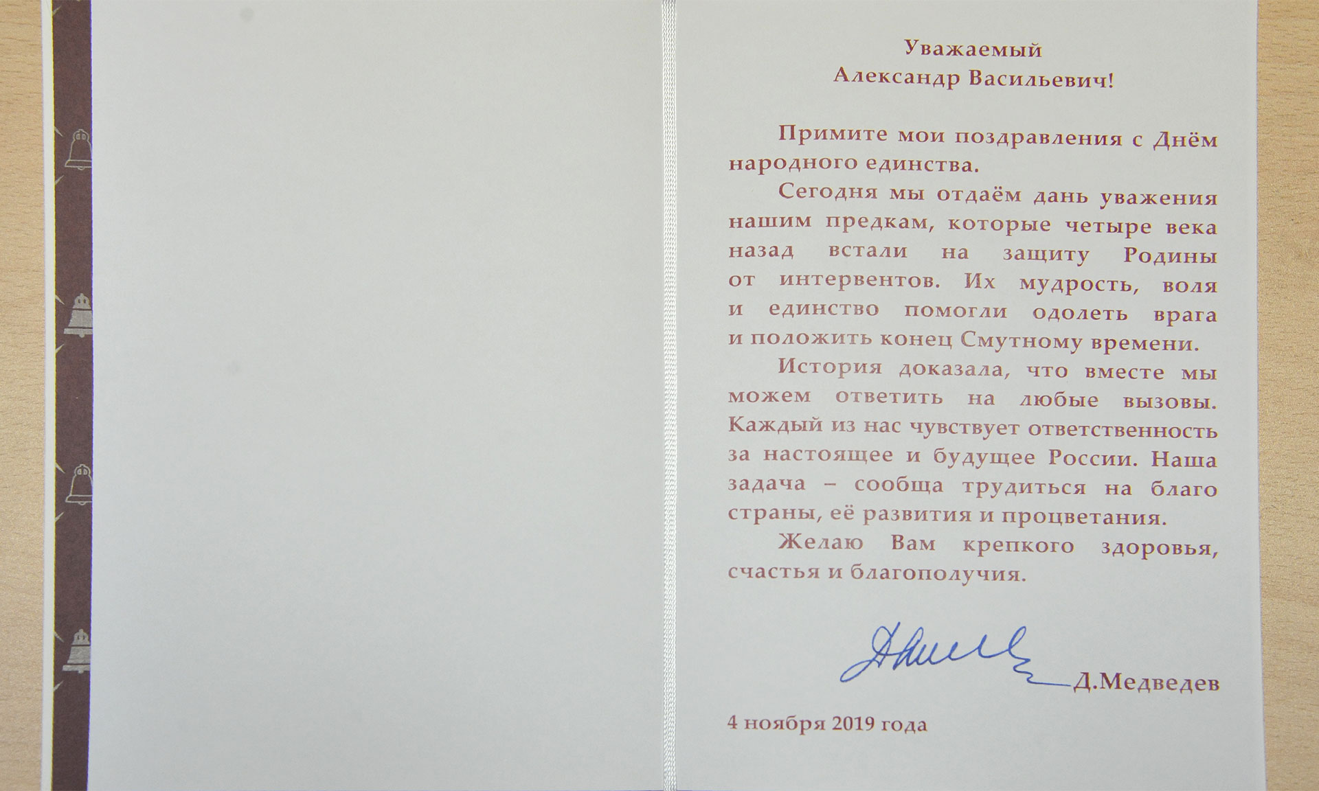 В адрес Губернатора Брянской области Александра Богомаза поступило поздравление с Днем народного единства от Председателя Правительства РФ Дмитрия Медведева. В поздравлении, в частности, говорится: